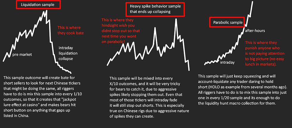 On macro, they hunt for those who seek "ideal scenarios" on consistent delivery. For example, a short seller who seeks liquidation collapse on every Chinese name, the riggers will rig every few tickers in a way that will try to trap and make a revenge trade trap for such a trader.