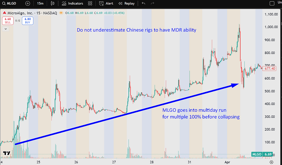 Yes, in fact, Chinese rigged names will also, every once in a while, go into a multiday running stage. There are a bunch of names I can remember from the last 12 months, perhaps HOLO, MEGL, MLGO, AEHL come to mind the quickest, but there is more. Once those tickers turn into multiday runners, they can complete excessive % moves, like well beyond 1000%, since day 1. Make sure you do not underestimate that and swing short carelessly. Remember that HOLO has last year set the record of 5000% multiday-runner move (from its base on day-0) as second highest squeezing ticker, only de-throned by this years SMX (6500%).